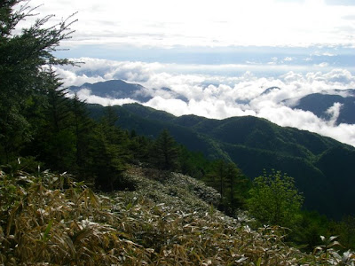 左手後方には雲の中から南アルプスのような影が見え隠れし期待をさせる。