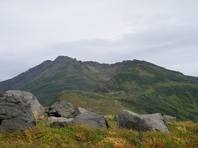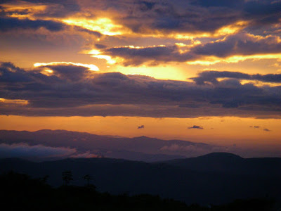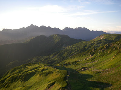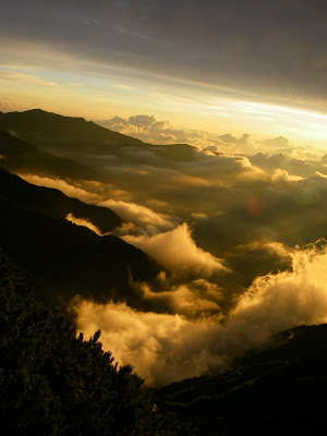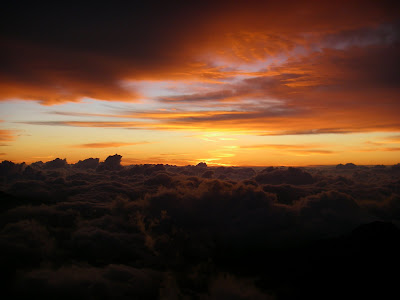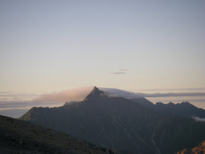 登り始めて6時間ようやく山頂へ到着。雲の合間から時々太陽が時々差し込み一瞬だけの景色が奇跡のように美しい。