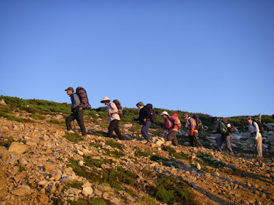 朝暗い中、4時に出発。登山口の大台野道へ到着。準備をしていたら激しい雨に洗礼を浴びた。登山者の中からは登りたくないとの声も出たが、雲は意外に薄そうだったので様子を見ながら登ることに、、