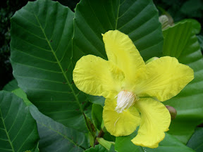 シンポエアーの「シンポ」はナタで木を切るときの擬音語。「エアー」はマレー語で水辺を意味します。道路沿いとか、気がつくと色んなところで見られますよ。葉っぱは、大きいので、昔は物を包むのに使われていました。
