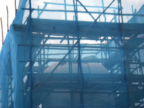今回は「落雷」でマーライオンがケガをしたため修復中であった。